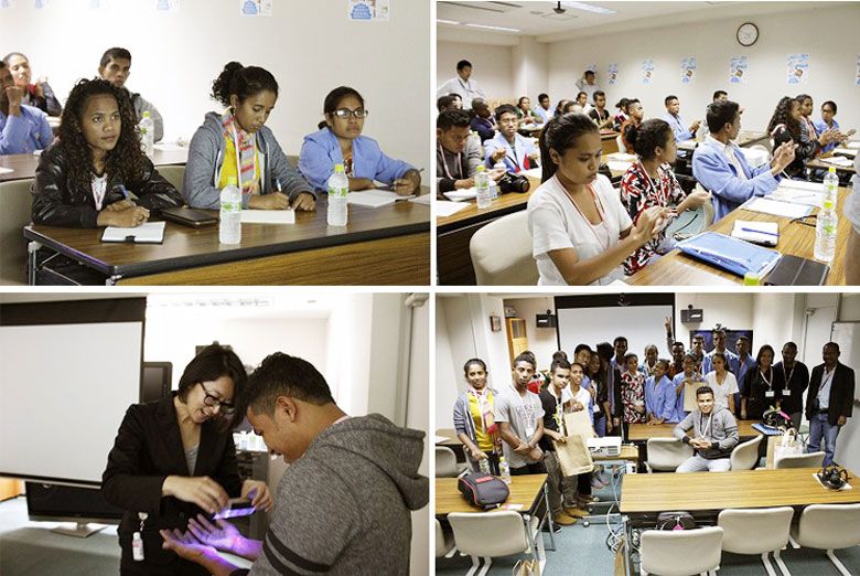 As a part of the JENESYS2015 Inbound Program, 22 medical university and graduate students from East Timor visited Japan on October 6. SARAYA invited them for a company tour and introduced them to our businesses, SARAYA East Africa, and the Wash a Million Hands Project in Uganda – SARAYA's handwashing promotional project. In the tour, we provided a handwashing seminar and talked about the mechanisms of healthcare-associated infections, the importance of handwashing, and 5 moments of hand hygiene. Handwashing demonstration was also conducted using the checker to find out missed areas during hand washing. They were surprised to see how easily we miss spots such as fingertips. After the first check, they learned the handwashing method recommended by the WHO and had it checked again. The second time they could perform better and deepen the understanding of hand washing. We hope the experience in SARAYA was enriching and informative for them!
